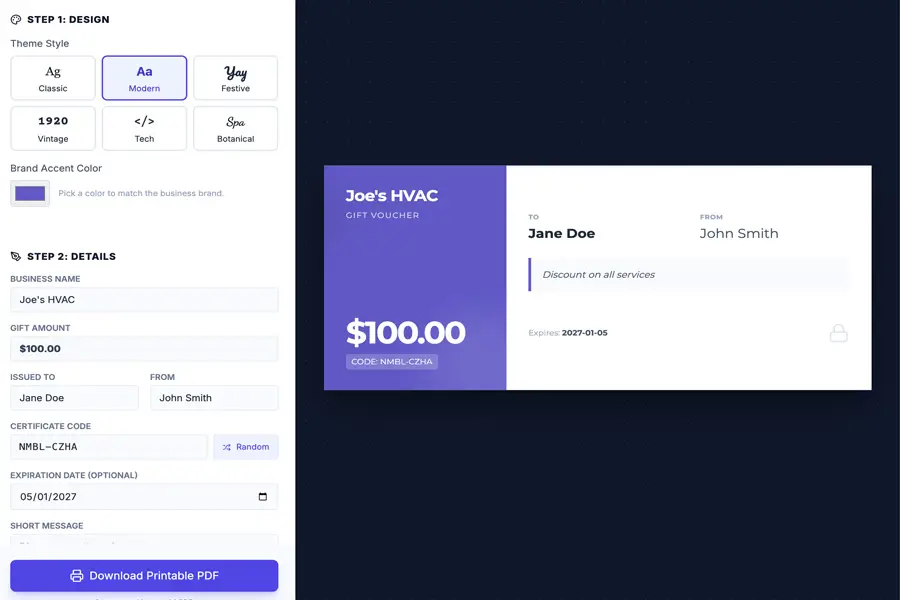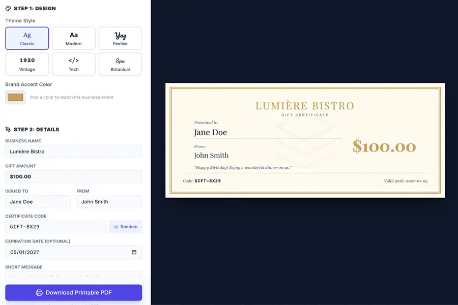 Create gift certificates you can sell or give away without hiring a designer. A fast way to boost cash flow and promote your business during holidays or slow periods.