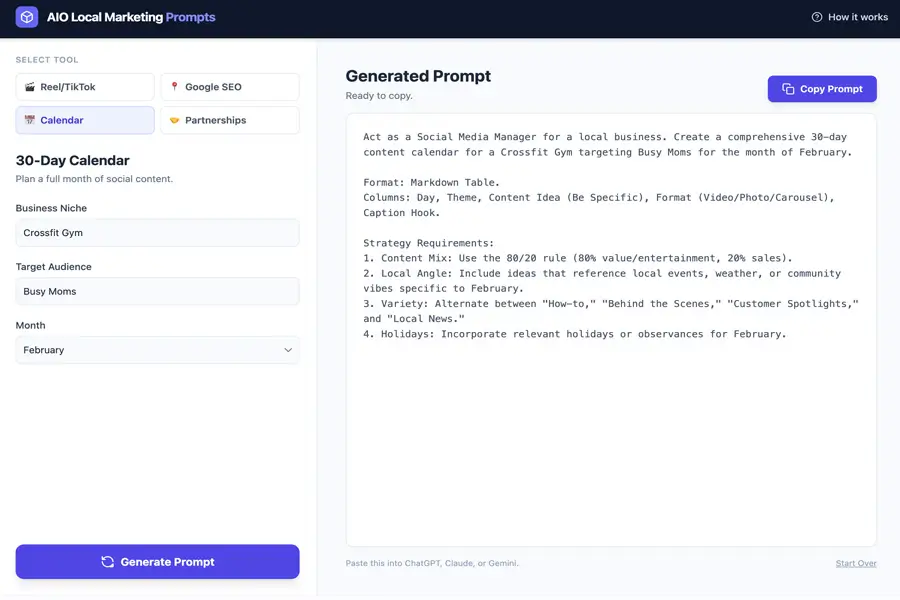Build structured prompts for different marketing assets like ads, posts, and banners. Keeps your visuals consistent across platforms.